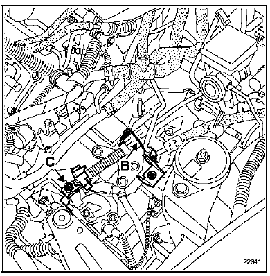 Dégrafer les Durit en (B), couper le collier plastique de maintien de la gaine de liaison des câbles de commande et déposer les deux vis de fixation de l'écran thermique en (D) et les quatre agrafes.