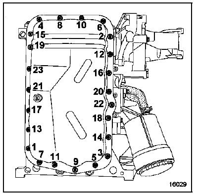 Serrer toutes les vis du carter inférieur au couple de 2,5 daN.m et dans l'ordre indiqué.