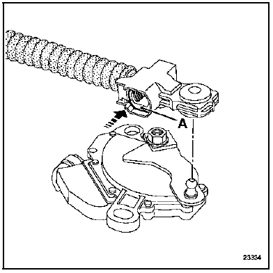 Déposer l'agrafe (A). Découper le dessous du boîtier suivant l'empreinte circulaire afin de dégager la rotule de câble de commande.