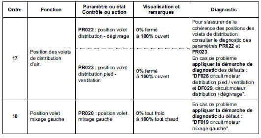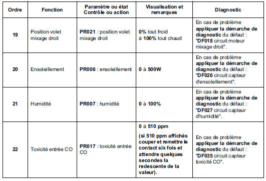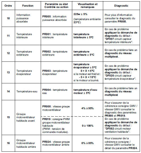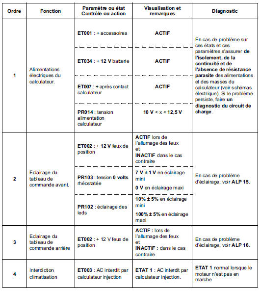 N'effectuer ce contrôle de conformité qu'après un contrôle complet à l'outil de diagnostic (les valeurs indiquées dans ce contrôle de conformité, ne sont données qu'à titre indicatif).