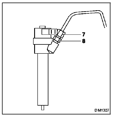 ATTENTION : Lors du desserrage des raccords (7) des tuyaux d'injection sur les porte-injecteurs, retenir impérativement les écrous (8) de maintien des filtretiges avec une contre-clé.