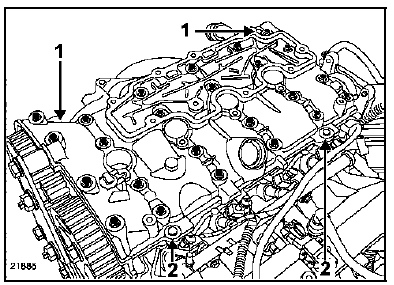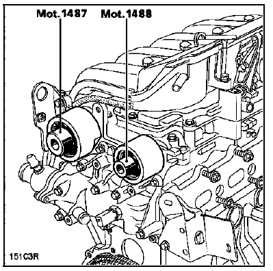 Mettre en place l'outil de blocage Mot. 1509 des arbres à cames, tout en serrant les écrous (1) au couple de 8 daN.m.