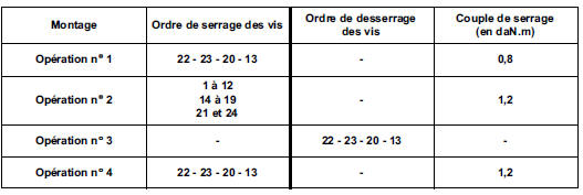 Ne pas huiler les vis neuves. En revanche, dans le cas de la réutilisation des vis, il faut impérativement les huiler. Serrage de toutes les vis à 2 daN.m dans l'ordre préconisé ci-dessous.