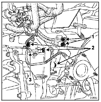 Extraire le tuyau d'embrayage après avoir retiré l'agrafe (1) sur le récepteur d'embrayage et déclipper en (2) le tuyau.