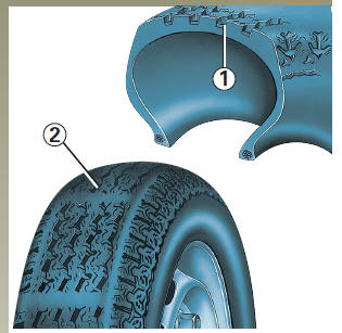 Les pneumatiques doivent être en bon état et leurs sculptures doivent présenter un relief suffisant ; les pneumatiques agréés par nos services techniques comportent des témoins d'usure 1 qui sont constitués de bossages-témoins incorporés dans l'épaisseur de la bande de roulement.