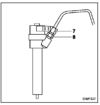 ATTENTION : Lors du desserrage des raccords (7) des tuyaux d'injection sur les porte-injecteurs, retenir impérativement les écrous (8) de maintien des filtretiges avec une contre-clé.