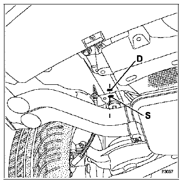 Lors d'une repose de train arrière il est impératif de positionner le berceau par rapport au longeron arrière à l'aide d'une pige en faisant correspondre les trous S du berceau avec les pilotes D des longerons. Pour des informations complémentaires se reporter aux chapitres correspondants du Manuel de Réparation.